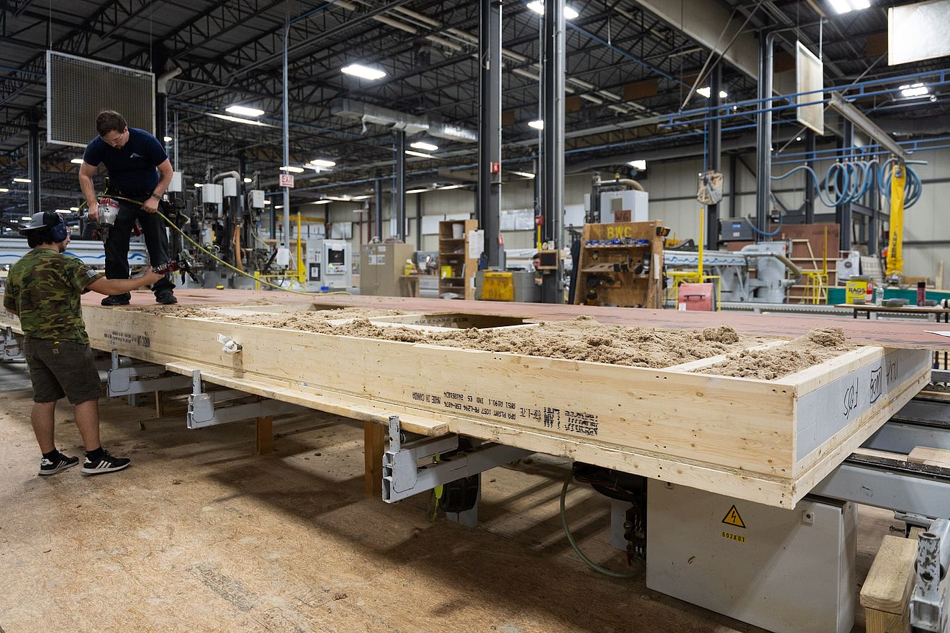Below: Part of the building envelope being constructed at the Bensonwood facility. The dense-pack cellulose insulation is a sustainable, energy-efficient, carbon-storing insulation option. Photo credit: Bensonwood.