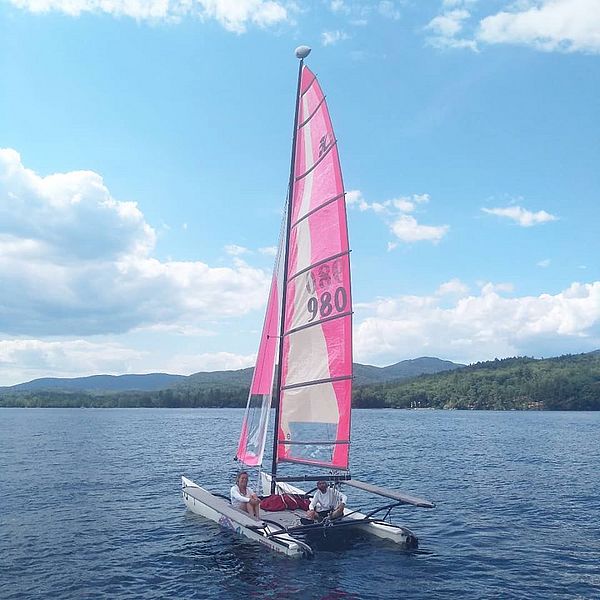 Scott Wilkas, who has been sailing for many years on Newfound, quickly pulled into the lead, with the flashy pink and white sail of Martin Kimbell’s Hobie 18 just behind. Kimbell eventually took the lead and reached the finish line with a time of 1 hour and 29 minutes to be this year’s first place finisher. Wilkas took second place with a time of 1 hour and 46 minutes, followed by Tripp Blair, the only boat that wasn’t a catamaran, with a time of 2 hours and 44 minutes.